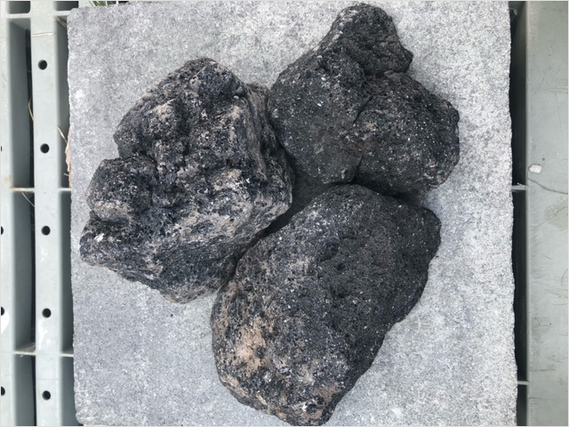 浅間石は浅間山の噴火から産まれた火山岩で、特に濡れた時の黒は美しく、緑をより引き立たせます。また、溶岩石は多孔質で、ごつごつした形状をしており、色味は数種類ありますが、基本的には黒色です